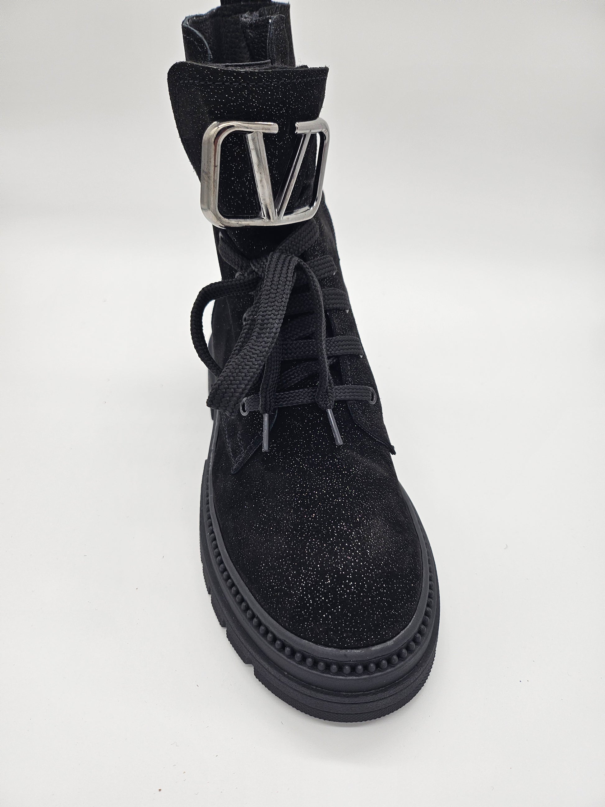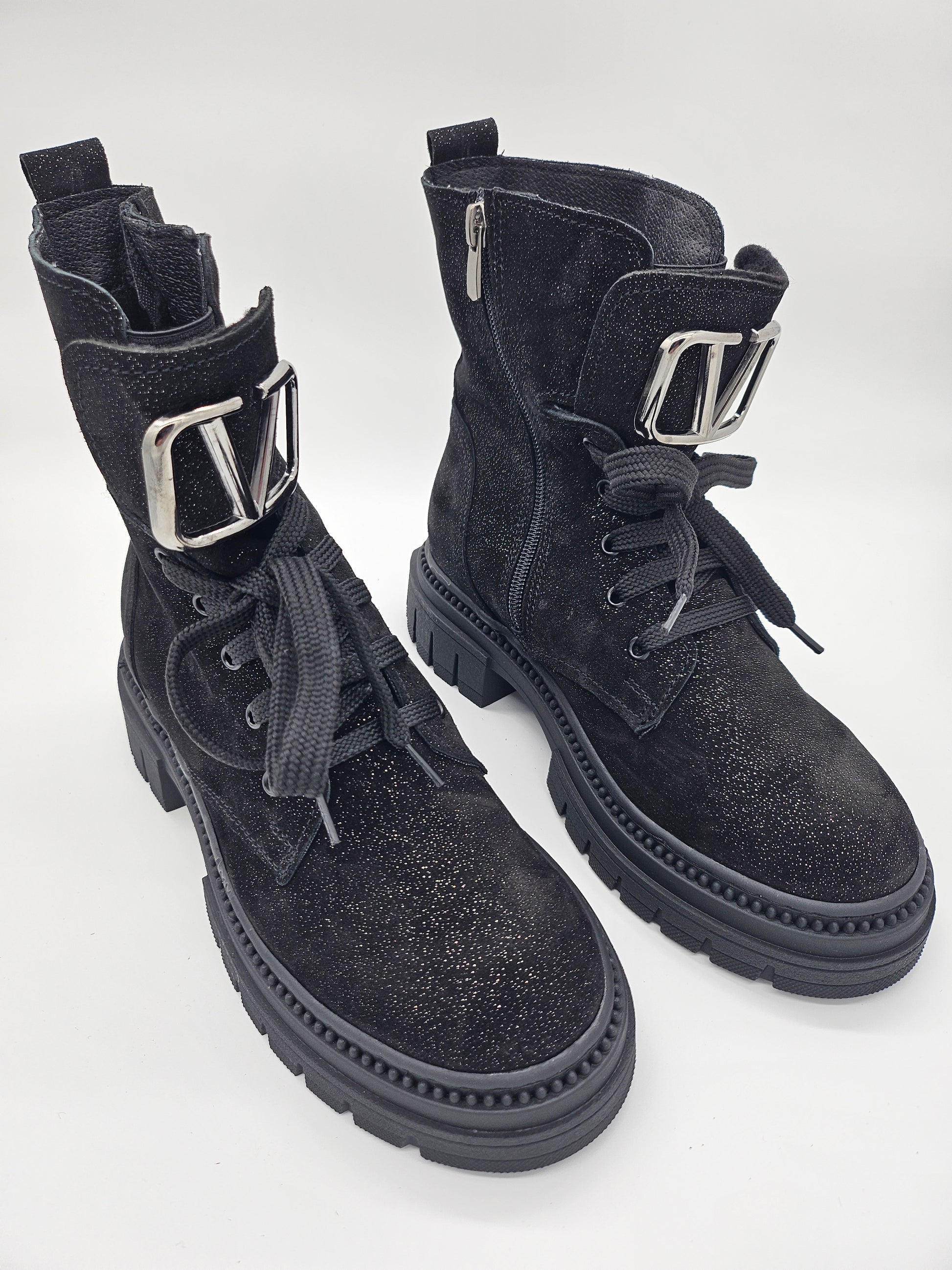 Внесете доза лукс и ефектен стил в зимния си гардероб с нашите дамски боти от естествена черна релефна лъскава кожа с фини бляскави частици. Тези боти са създадени да привличат погледи, като същевременно осигуряват несравним комфорт. Топъл текстилен хастар обгръща крака ви с уют, а стабилното шито грайферно ходило гарантира сигурност и лекота при всяка стъпка. Връзките и ципът улесняват обуването и осигуряват перфектно прилягане, докато красивият метален аксесоар на езика добавя изискан и завършен вид.