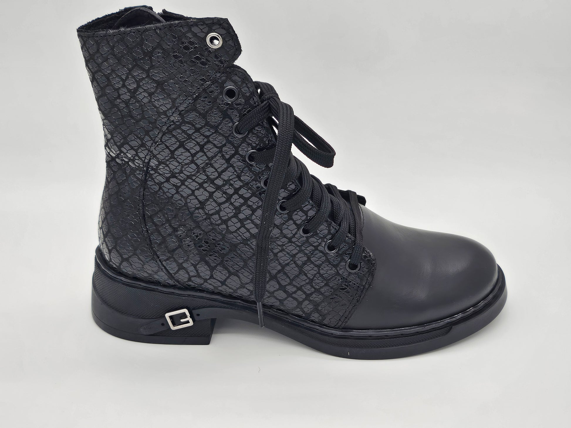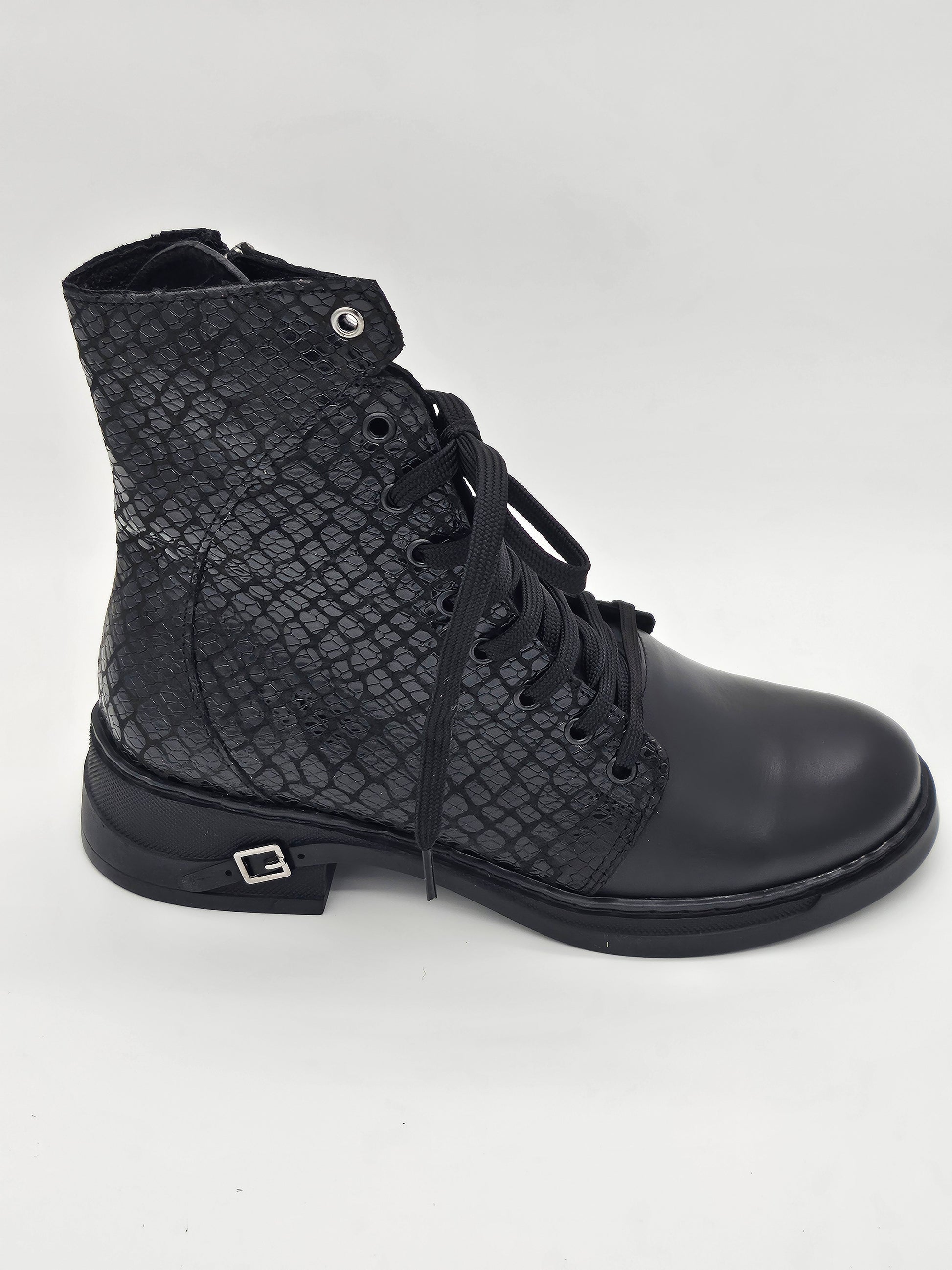 Изящната дантела в горната част придава уникален и женствен акцент, превръщайки традиционния модел в модно изявление. Практичността е на първо място – системата с връзки и цип гарантира лесно и бързо обуване, което спестява време и усилия.