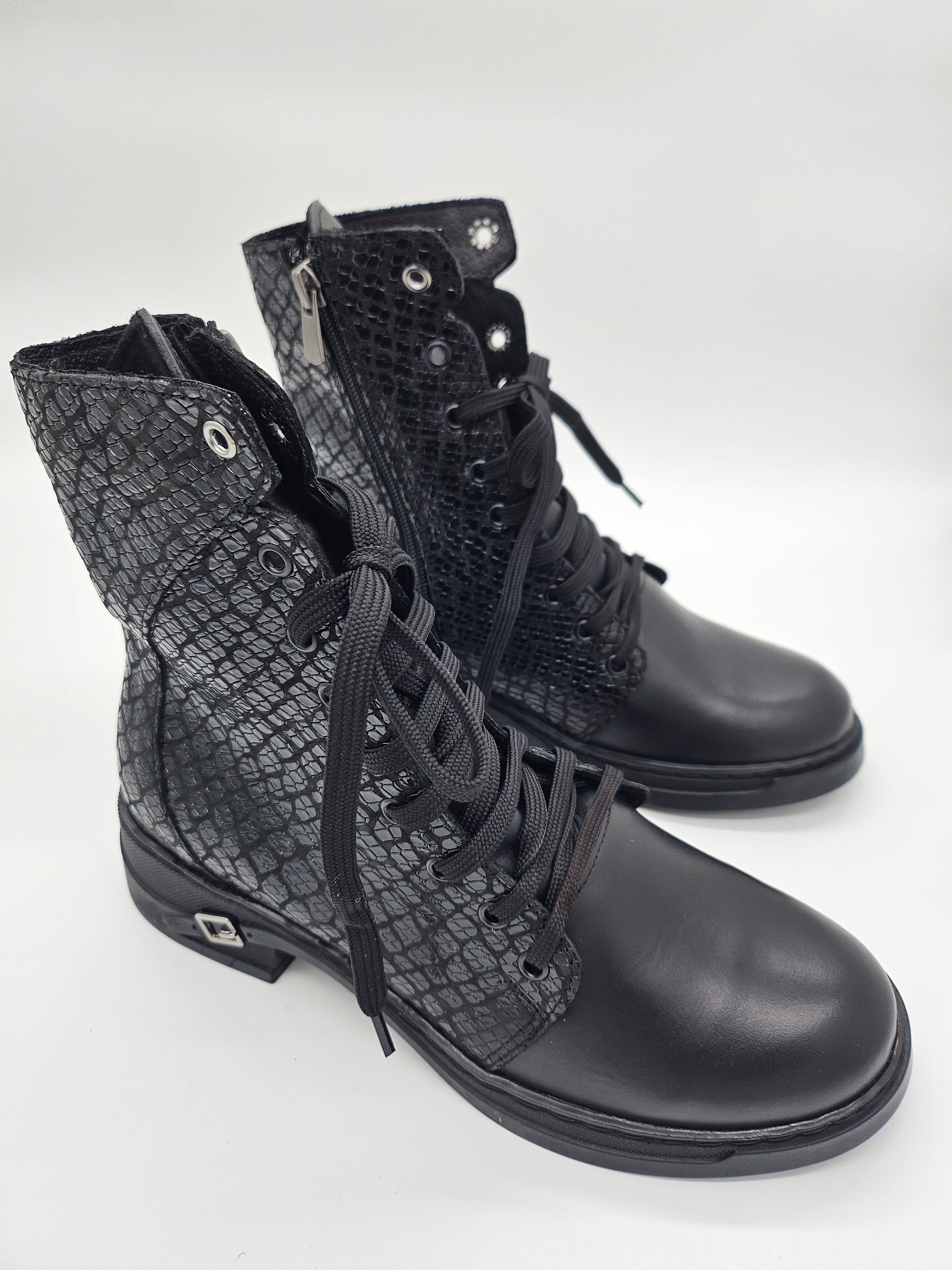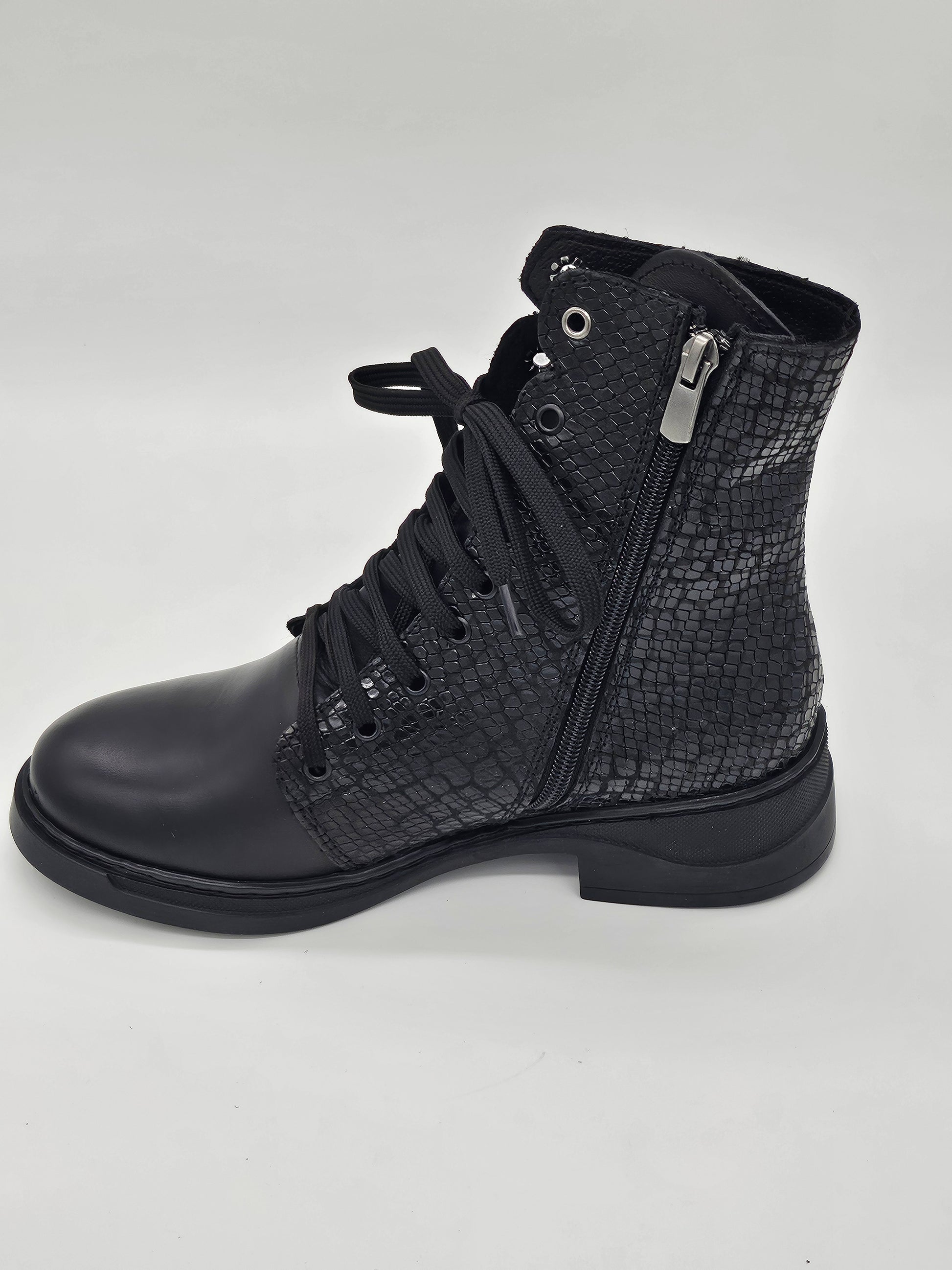 Български дамски кожени боти в черен цвят с връзки и цип