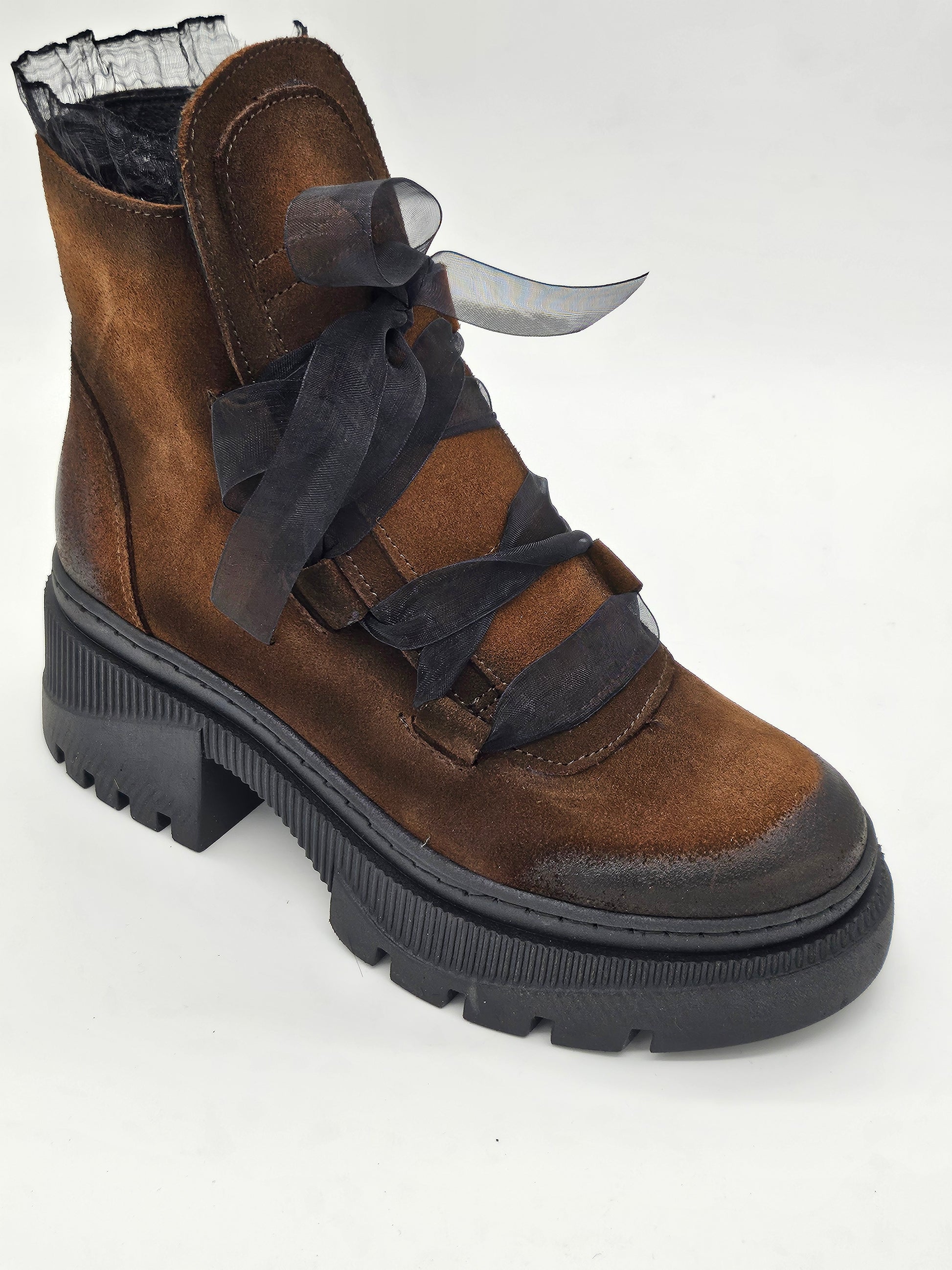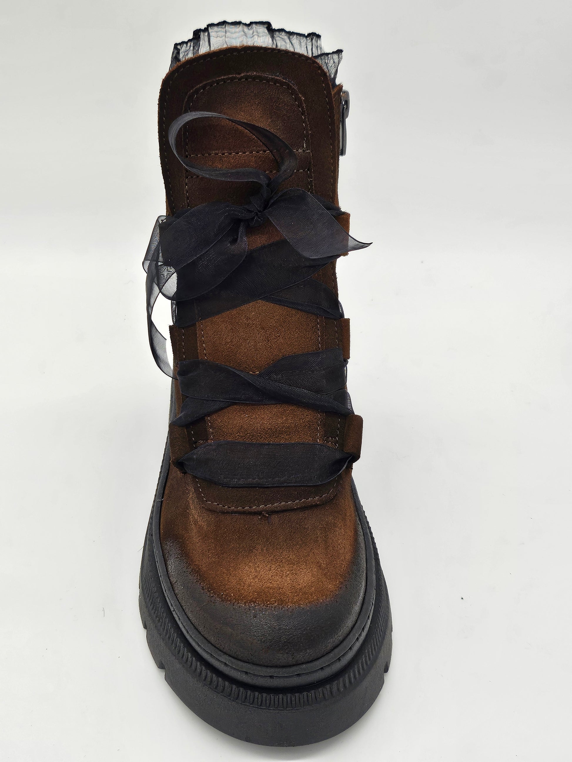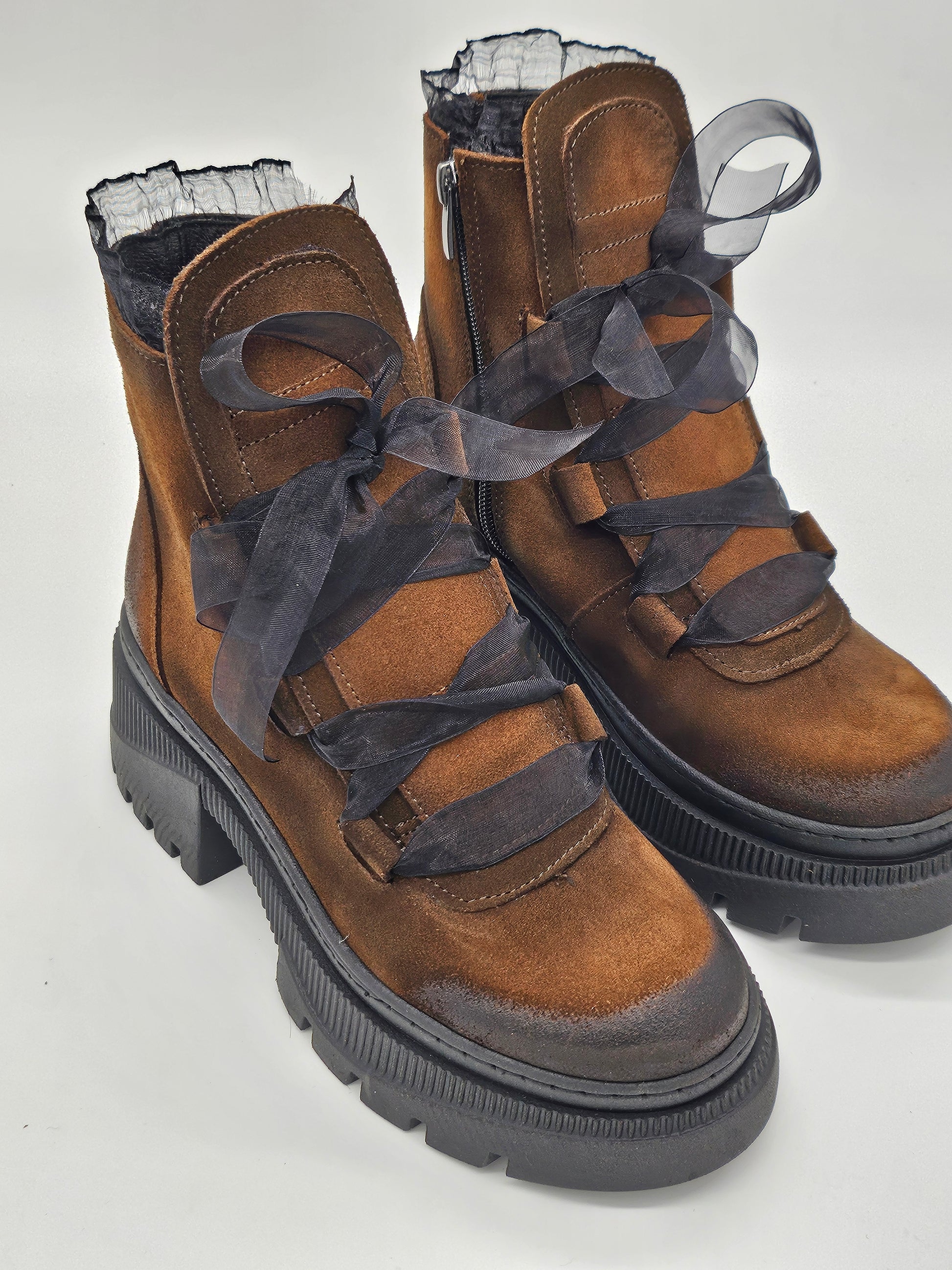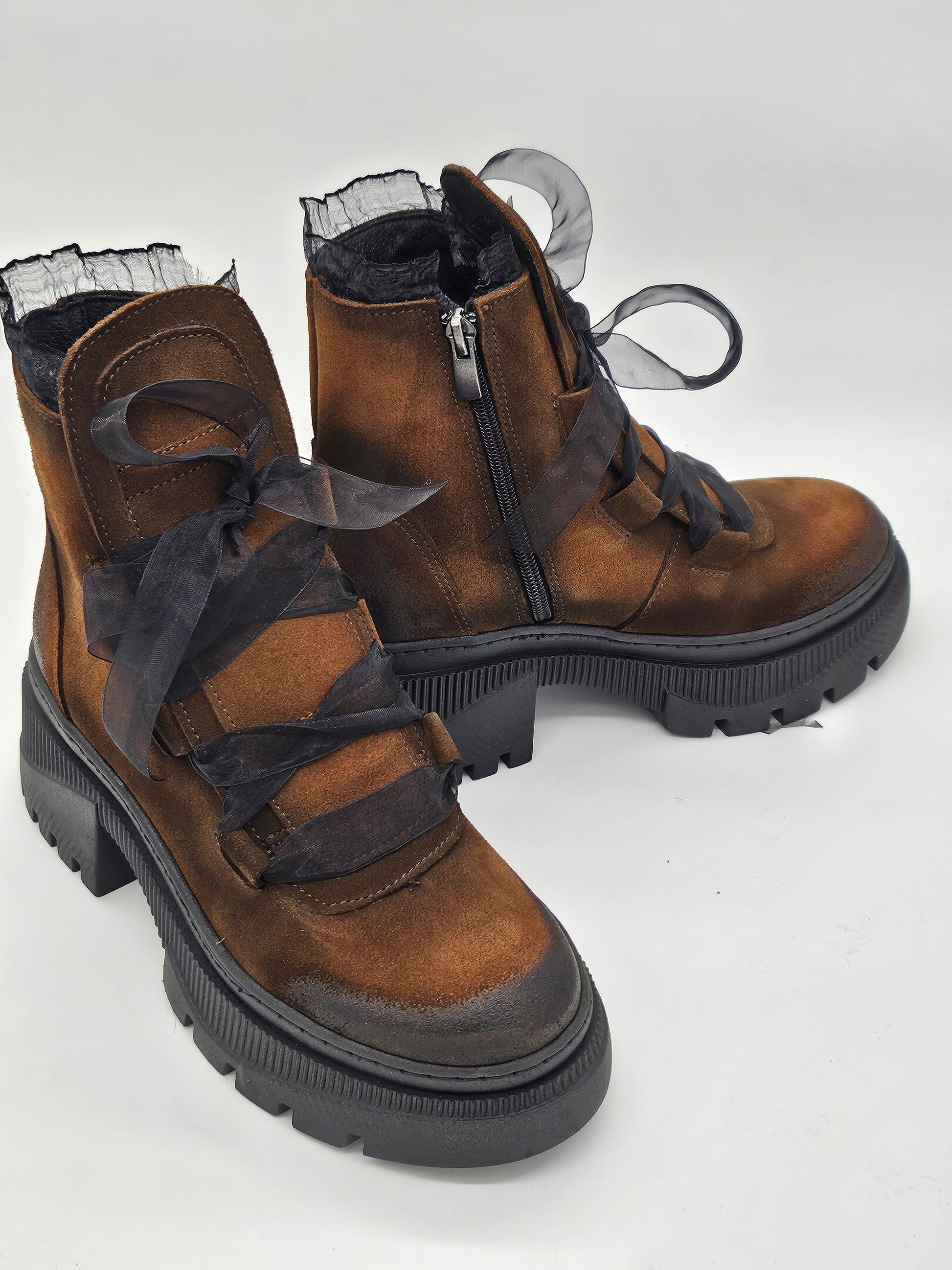 Представяме Ви дамски боти, произведени в България, изработени от ефектна естествена кожа в наситен кафяв цвят .Този модел е създаден за жената, която обича да експериментира със стила, без да прави компромис с качеството и комфорта.За стабилна и сигурна крачка, ходилото е ефектно грайферно и здраво шито, като повдигнатата платформа с височина от 6.5 см отзад и 4 см отпред осигурява не само удобство, но и удължава визуално силуета.