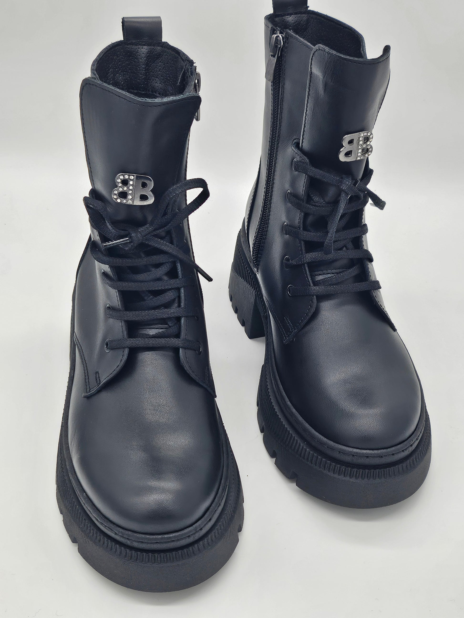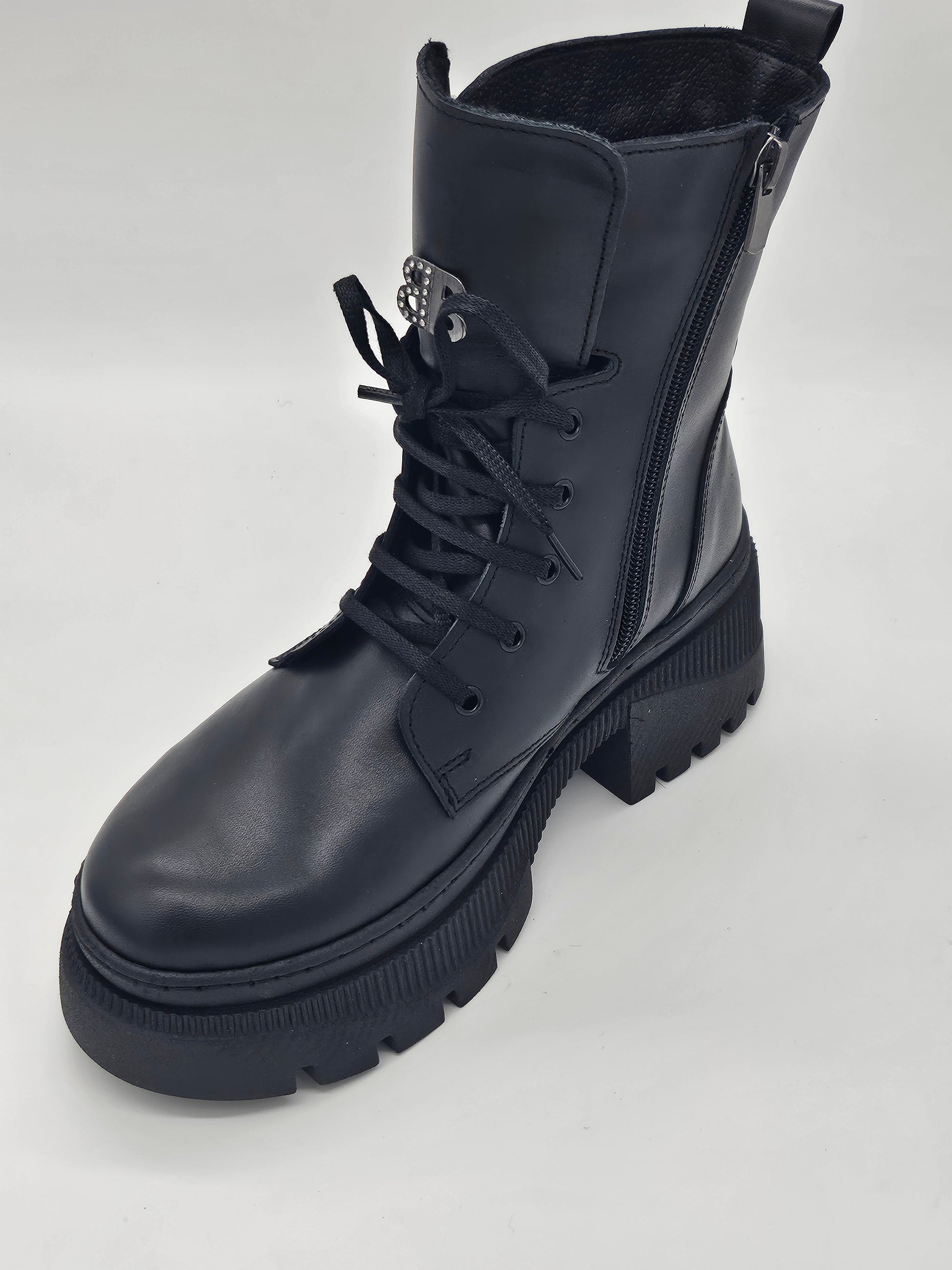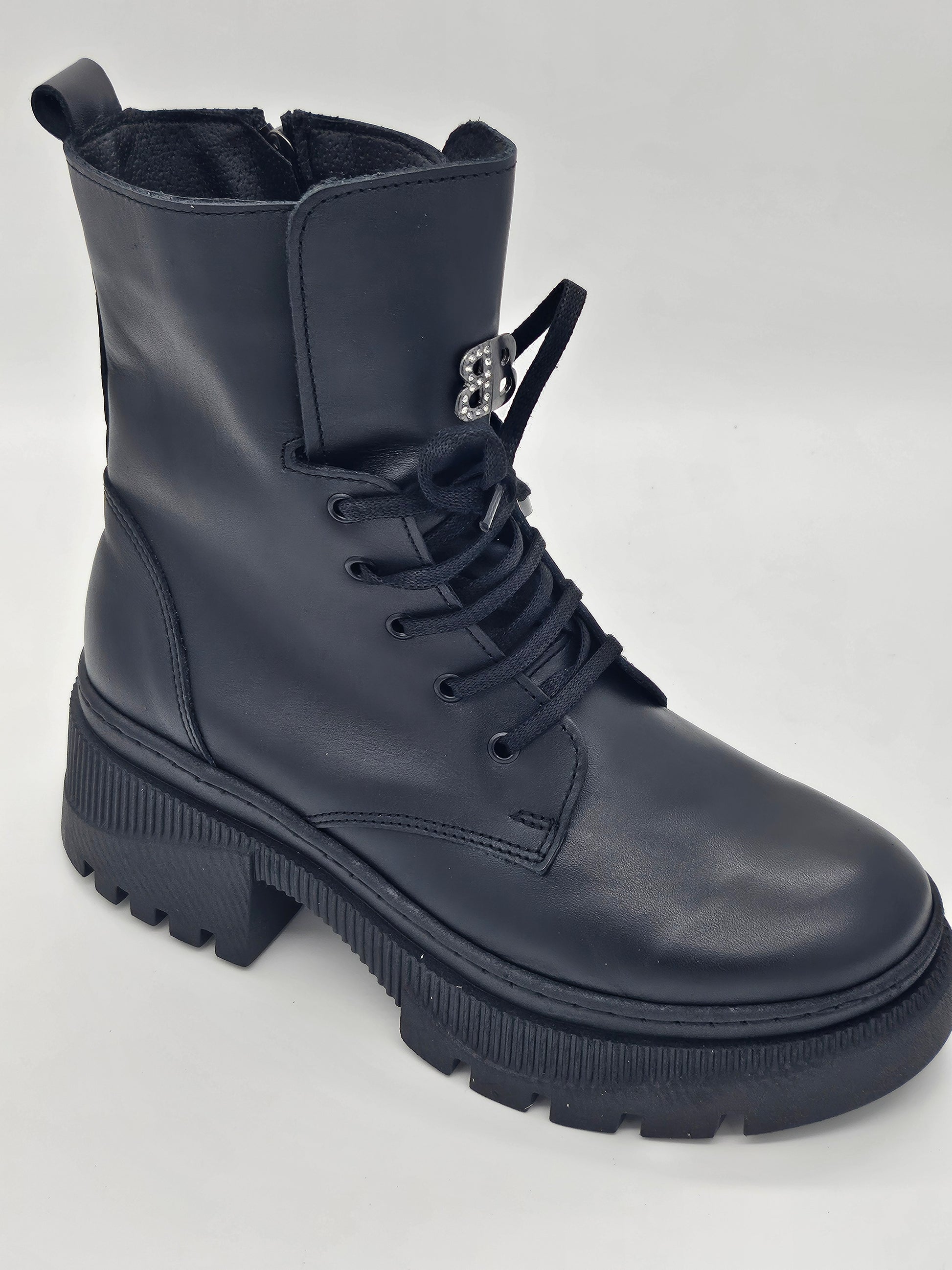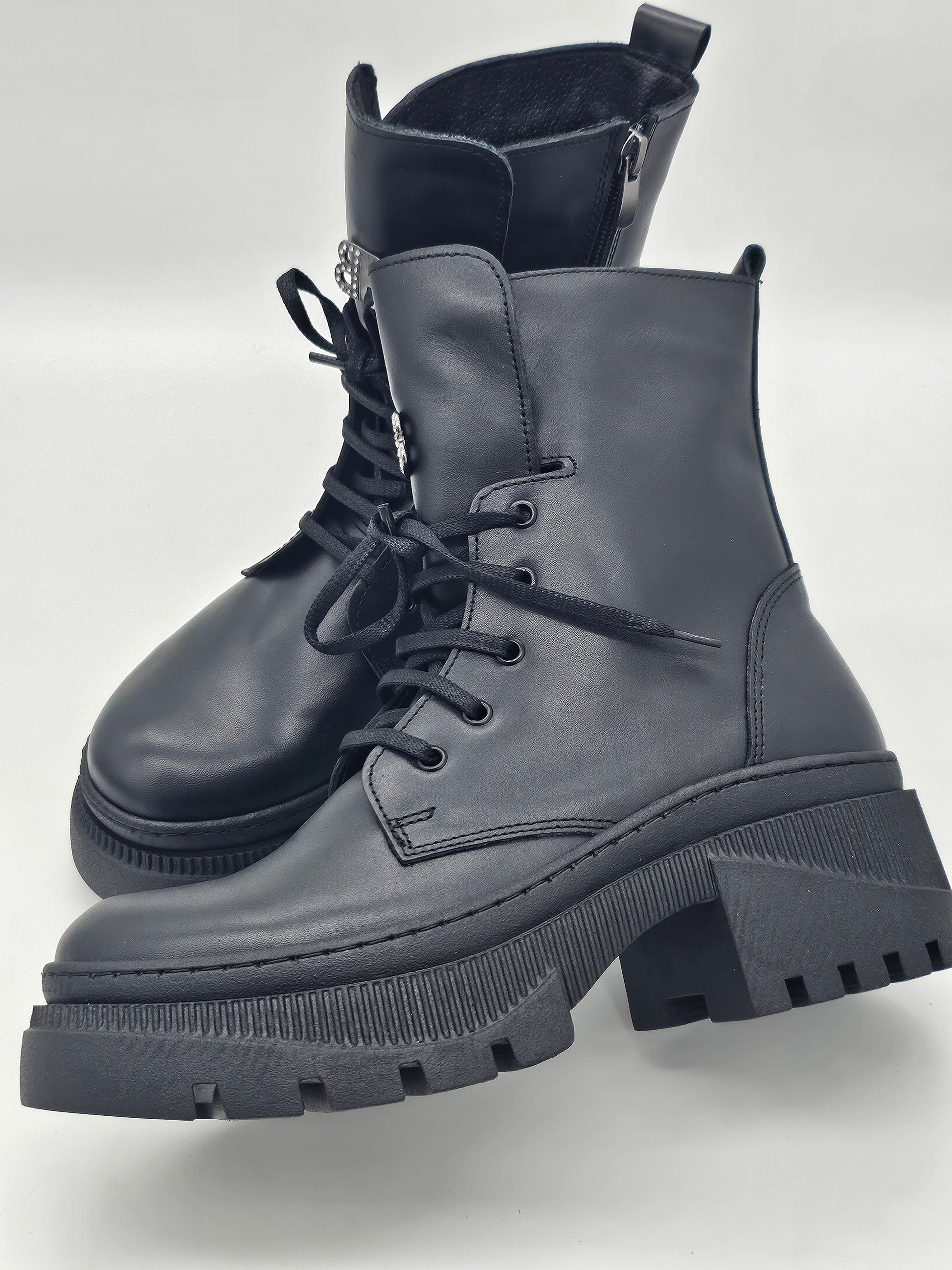 Посрещнете деня с увереност и стил! Тези български дамски кубинки от естествена кожа в класическо черно са идеалният начин да добавите характер към всеки тоалет. Създадени за съвременната жена, която цени както елегантността, така и комфорта. Лесното обуване е осигурено от комбинацията на връзки и удобен цип, което ги прави перфектни за динамичното ежедневие. Нежната дантела в горната част придава изискан и женствен акцент, превръщайки ги от обикновени кубинки в произведение на изкуството.