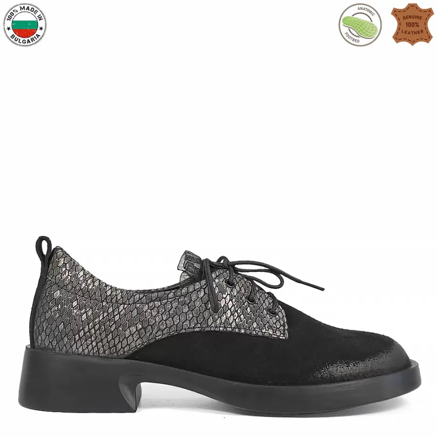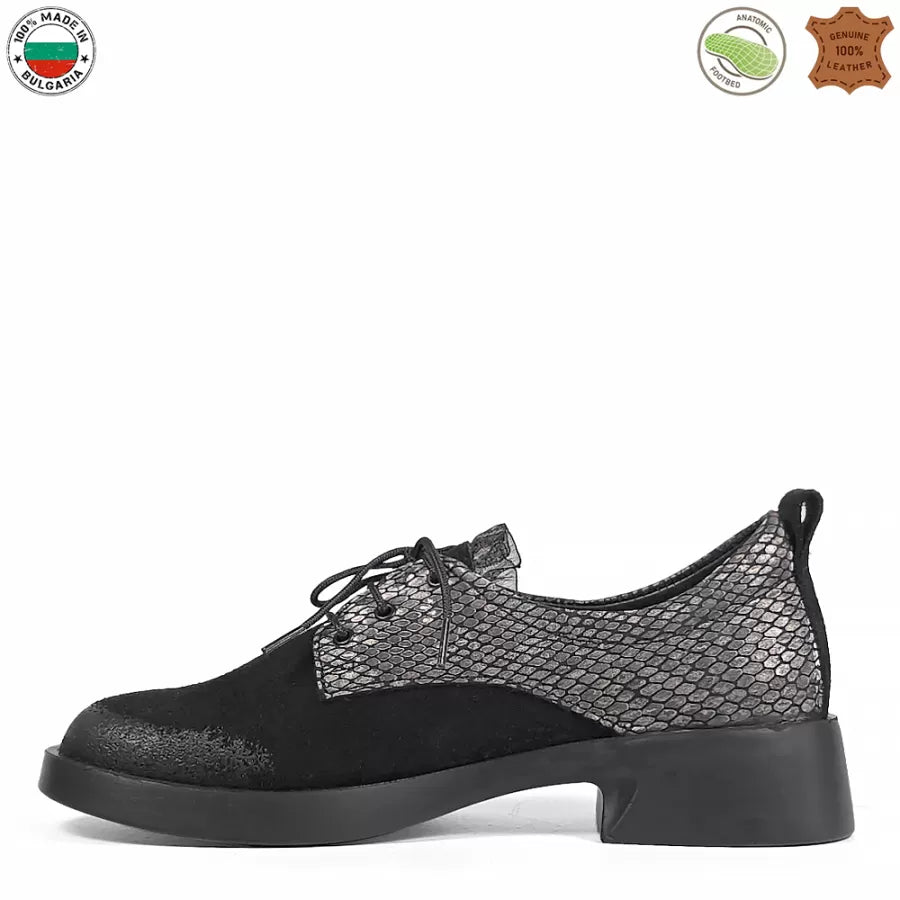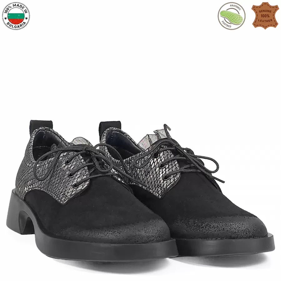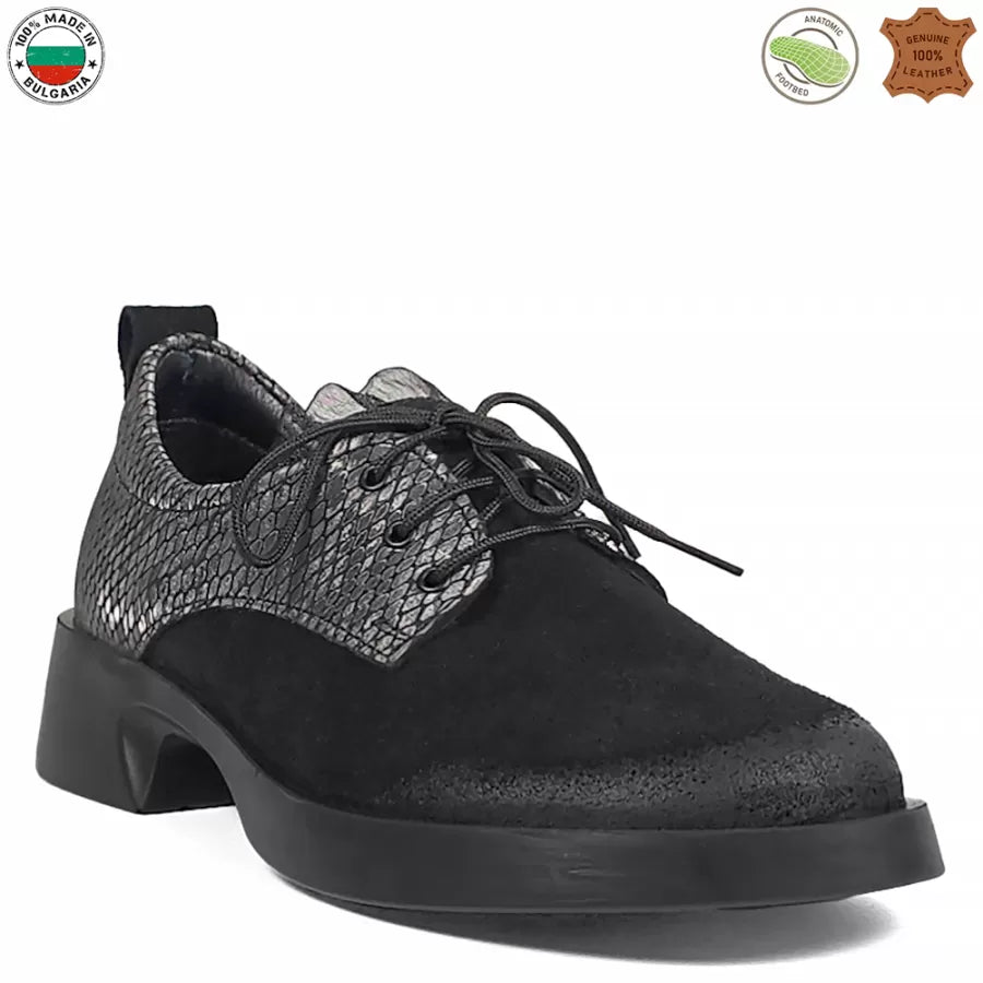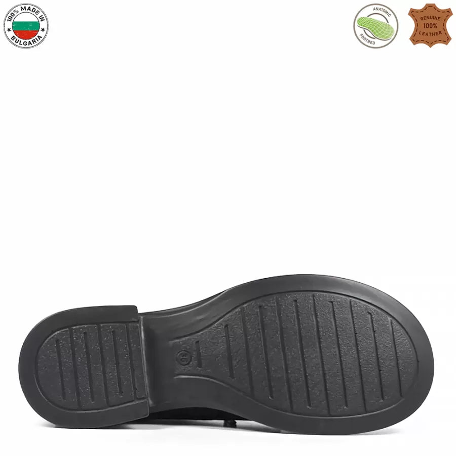 Представяме ви тези стилни и удобни български дамски обувки, които са идеални за вашето ежедневие. Изработени от висококачествен естествен велур с търкан ефект и ефектна естествена кожа, тези обувки предлагат комфорт и издръжливост през целия ден. Черният цвят придава на обувките класически и елегантен вид, който лесно се комбинира с различни стилове облекло. Ниският ток осигурява стабилност и комфорт при ходене, което ги прави подходящи както за работа, така и за разходки или срещи с приятели. Стелката от естествена кожа осигурява допълнителен комфорт и подкрепа за крака. Дизайнът на обувките е изчистен и изтънчен, което ги прави подходящи за всякакъв повод.